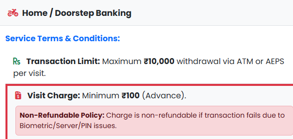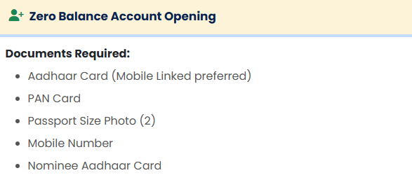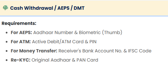 Zero balance account opening, AEPS, cash withdrawal, domestic money transfer, credit & EMI cards, and doorstep banking support.